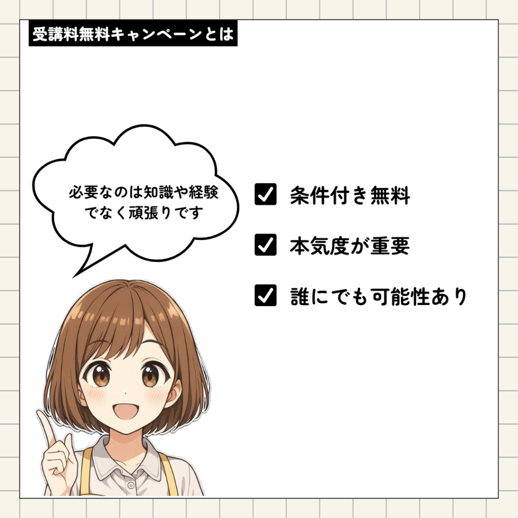つまり、あなたのやる気次第で、受講料が無料になるチャンスがあるという仕組みなんです!
