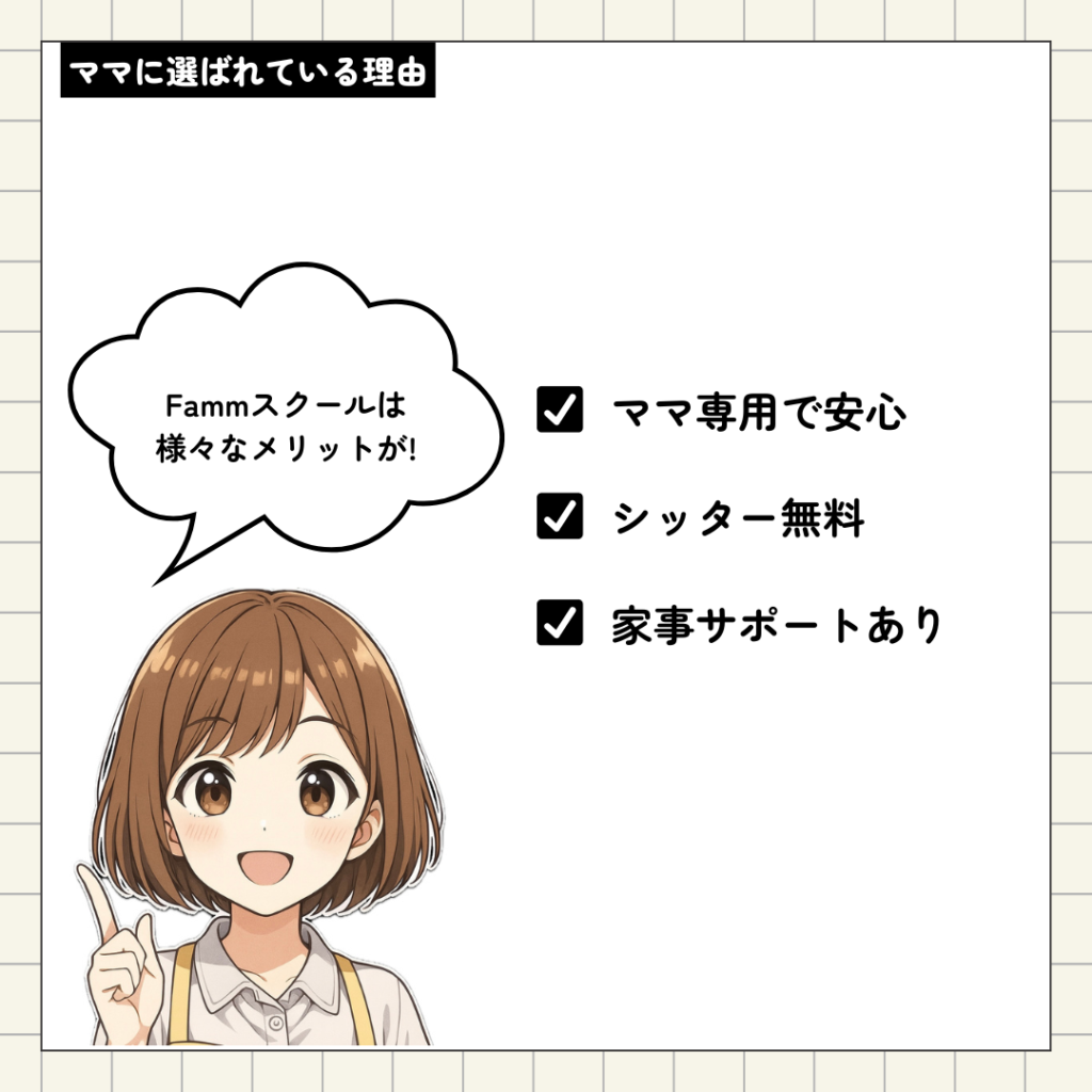 Fammスクールは、「ママに特化したサポート」が圧倒的に充実している点が最大の魅力です。