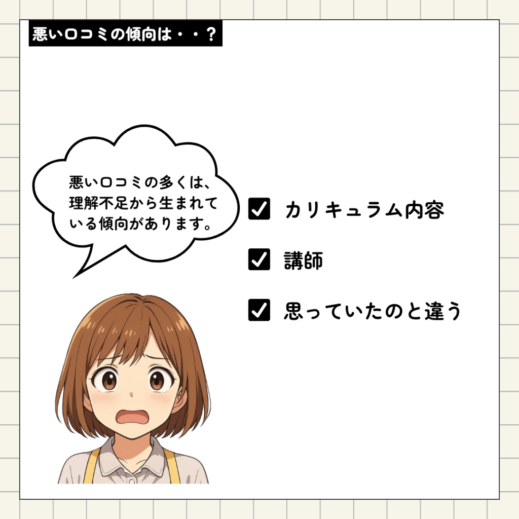 とはいえ、受講を検討するうえでネガティブな意見も気になるのが本音ですよね。